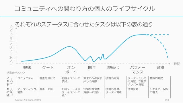 - 199. Tuckman のモデルなどを参考 199 コミュニティへの関わり方の個人のライフサイクル コミュニティ 審査を受ける 初期イベントの 参加、 集まりへの参加、 少しの貢献 役割の実施 リーダーとして の貢献、次世代 メンバー貢献 意識的離脱、 マーケティング、 勧誘 審査、面談、 初期フェーズ支 援、イベントの 紹介 定常的な勧誘、 貢献への誘引 役割の提供、 リーダー育成 役割変更 引き止め、関与 の増大 時間 エンゲージメントのレベル 興味 ゲート オン ボード 関与 規範化 パフォー マンス 離脱 新メン バー 既存メ ンバー 活動やタスク それぞれのステータスに合わせたタスクは以下の表の通り