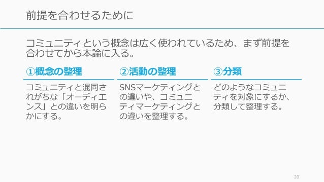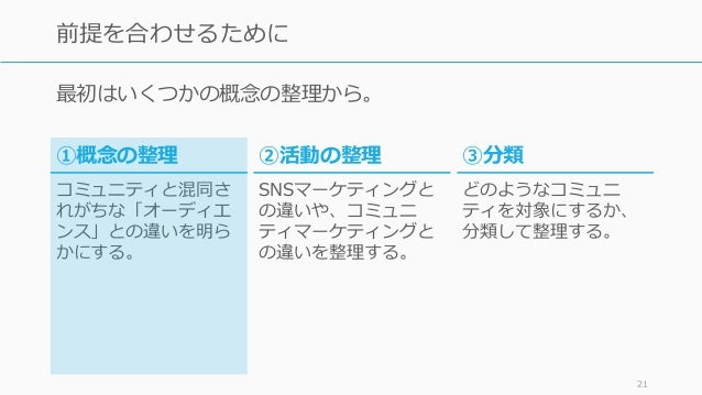 - 20. コミュニティという概念は広く使われているため、まず前提を 合わせてから本論に入る。 20 前提を合わせるために ③分類 どのようなコミュニ ティを対象にするか、 分類して整理する。 ①概念の整理 コミュニティと混同さ れがちな「オーディエ ンス」との違いを明ら かにする。 ②活動の整理 SNSマーケティングと の違いや、コミュニ ティマーケティングと の違いを整理する。