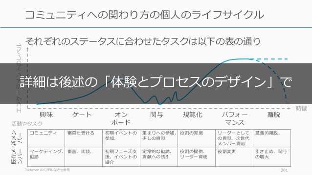 - 201. Tuckman のモデルなどを参考 201 コミュニティへの関わり方の個人のライフサイクル コミュニティ 審査を受ける 初期イベントの 参加、 集まりへの参加、 少しの貢献 役割の実施 リーダーとして の貢献、次世代 メンバー貢献 意識的離脱、 マーケティング、 勧誘 審査、面談、 初期フェーズ支 援、イベントの 紹介 定常的な勧誘、 貢献への誘引 役割の提供、 リーダー育成 役割変更 引き止め、関与 の増大 時間 エンゲージメントのレベル 興味 ゲート オン ボード 関与 規範化 パフォー マンス 離脱 新メン バー 既存メ ンバー 活動やタスク それぞれのステータスに合わせたタスクは以下の表の通り 詳細は後述の「体験とプロセスのデザイン」で