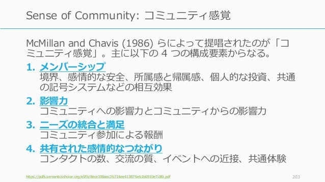 - 203. McMillan and Chavis (1986) らによって提唱されたのが「コ ミュニティ感覚」。主に以下の 4 つの構成要素からなる。 1. メンバーシップ 境界、感情的な安全、所属感と帰属感、個人的な投資、共通 の記号システムなどの相互効果 2. 影響力 コミュニティへの影響力とコミュニティからの影響力 3. ニーズの統合と満足 コミュニティ参加による報酬 4. 共有された感情的なつながり コンタクトの数、交流の質、イベントへの近接、共通体験 https://pdfs.semanticscholar.org/e5fb/8ece108aec36714ee413876e61b0510e7c80.pdf 203 Sense of Community: コミュニティ感覚