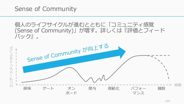 - 204. 個人のライフサイクルが進むとともに「コミュニティ感覚 (Sense of Community)」が増す。詳しくは『評価とフィード バック』。 204 Sense of Community 時間 エンゲージメントのレベル 興味 ゲート オン ボード 関与 規範化 パフォー マンス 離脱
