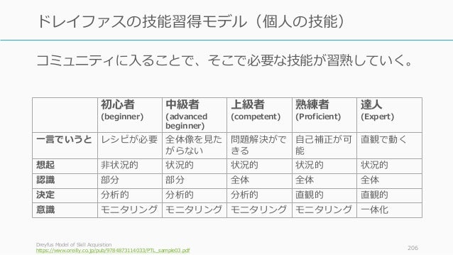 - 206. コミュニティに入ることで、そこで必要な技能が習熟していく。 Dreyfus Model of Skill Acquisition https://www.oreilly.co.jp/pub/9784873114033/PTL_sample03.pdf 206 ドレイファスの技能習得モデル(個人の技能) 初心者 (beginner) 中級者 (advanced beginner) 上級者 (competent) 熟練者 (Proficient) 達人 (Expert) 一言でいうと レシピが必要 全体像を見た がらない 問題解決がで きる 自己補正が可 能 直観で動く 想起 非状況的 状況的 状況的 状況的 状況的 認識 部分 部分 全体 全体 全体 決定 分析的 分析的 分析的 直観的 直観的 意識 モニタリング モニタリング モニタリング モニタリング 一体化