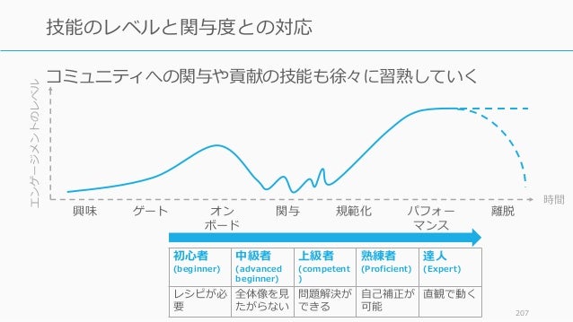 - 207. 初心者 (beginner) 中級者 (advanced beginner) 上級者 (competent ) 熟練者 (Proficient) 達人 (Expert) レシピが必 要 全体像を見 たがらない 問題解決が できる 自己補正が 可能 直観で動く 207 技能のレベルと関与度との対応 時間 エンゲージメントのレベル 興味 ゲート オン ボード 関与 規範化 離脱パフォー マンス コミュニティへの関与や貢献の技能も徐々に習熟していく