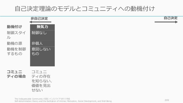 - 209. 動機付け 無気力 外発的動機 内発的動機 制御スタイ ル 制御なし 外発的な制 御 取り込み型 制御 特定された 制御 統合された 制御 内発的な制 御 動機の源 非個人 外部 幾分か外部 幾分か内部 内部 内部 動機を制御 するもの 意図しない もの コンプライ アンス、外 部報酬、罰 自己コント ロール、エ ゴ、内発的 報酬+罰 個人の重要 性、意識的 な価値づけ 調和、覚醒、 自己との統 合 興味、楽し み、内在的 満足感 コミュニ ティの場合 コミュニ ティの存在 を知らない、 価値を見出 せない 即時的な満足感 問題を解決したい、スキル や知識を上げたい、同士と の情熱の共有 社会的報酬 ステータスを上げたい、集 団的規範、同士との情熱の 共有 トピックへ の本当の興 味、コミュ ニティを楽 しむ、誰か の支援への 満足感The Indispensable Community の図にインスパイアされて作成 Self-determination theory and the facilitation of intrinsic Motivation, Social Development, and Well-Being 209 自己決定理論のモデルとコミュニティへの動機付け 自己決定非自己決定
