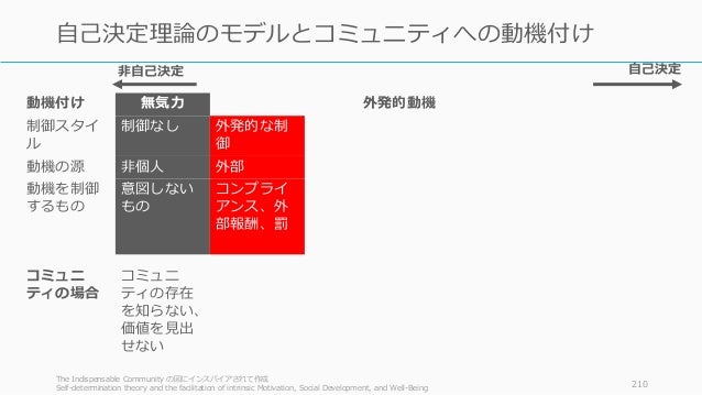 - 210. 動機付け 無気力 外発的動機 内発的動機 制御スタイ ル 制御なし 外発的な制 御 取り込み型 制御 特定された 制御 統合された 制御 内発的な制 御 動機の源 非個人 外部 幾分か外部 幾分か内部 内部 内部 動機を制御 するもの 意図しない もの コンプライ アンス、外 部報酬、罰 自己コント ロール、エ ゴ、内発的 報酬+罰 個人の重要 性、意識的 な価値づけ 調和、覚醒、 自己との統 合 興味、楽し み、内在的 満足感 コミュニ ティの場合 コミュニ ティの存在 を知らない、 価値を見出 せない 即時的な満足感 問題を解決したい、スキル や知識を上げたい、同士と の情熱の共有 社会的報酬 ステータスを上げたい、集 団的規範、同士との情熱の 共有 トピックへ の本当の興 味、コミュ ニティを楽 しむ、誰か の支援への 満足感The Indispensable Community の図にインスパイアされて作成 Self-determination theory and the facilitation of intrinsic Motivation, Social Development, and Well-Being 210 自己決定理論のモデルとコミュニティへの動機付け 自己決定非自己決定
