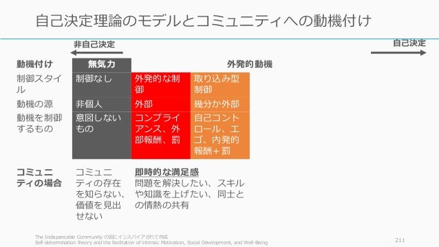 - 211. 動機付け 無気力 外発的動機 内発的動機 制御スタイ ル 制御なし 外発的な制 御 取り込み型 制御 特定された 制御 統合された 制御 内発的な制 御 動機の源 非個人 外部 幾分か外部 幾分か内部 内部 内部 動機を制御 するもの 意図しない もの コンプライ アンス、外 部報酬、罰 自己コント ロール、エ ゴ、内発的 報酬+罰 個人の重要 性、意識的 な価値づけ 調和、覚醒、 自己との統 合 興味、楽し み、内在的 満足感 コミュニ ティの場合 コミュニ ティの存在 を知らない、 価値を見出 せない 即時的な満足感 問題を解決したい、スキル や知識を上げたい、同士と の情熱の共有 The Indispensable Community の図にインスパイアされて作成 Self-determination theory and the facilitation of intrinsic Motivation, Social Development, and Well-Being 211 自己決定理論のモデルとコミュニティへの動機付け 自己決定非自己決定