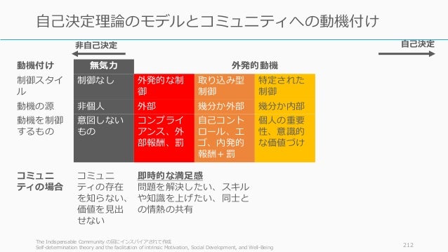 - 212. 動機付け 無気力 外発的動機 内発的動機 制御スタイ ル 制御なし 外発的な制 御 取り込み型 制御 特定された 制御 統合された 制御 内発的な制 御 動機の源 非個人 外部 幾分か外部 幾分か内部 内部 内部 動機を制御 するもの 意図しない もの コンプライ アンス、外 部報酬、罰 自己コント ロール、エ ゴ、内発的 報酬+罰 個人の重要 性、意識的 な価値づけ 調和、覚醒、 自己との統 合 興味、楽し み、内在的 満足感 コミュニ ティの場合 コミュニ ティの存在 を知らない、 価値を見出 せない 即時的な満足感 問題を解決したい、スキル や知識を上げたい、同士と の情熱の共有 社会的報酬 ステータスを上げたい、集 団的規範、同士との情熱の 共有 トピックへ の本当の興 味、コミュ ニティを楽 しむ、誰か の支援への 満足感The Indispensable Community の図にインスパイアされて作成 Self-determination theory and the facilitation of intrinsic Motivation, Social Development, and Well-Being 212 自己決定理論のモデルとコミュニティへの動機付け 自己決定非自己決定