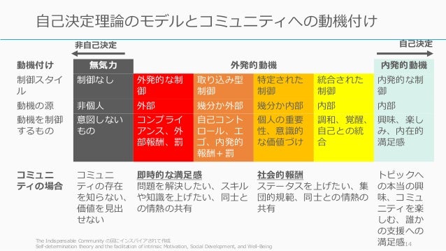 - 214. 動機付け 無気力 外発的動機 内発的動機 制御スタイ ル 制御なし 外発的な制 御 取り込み型 制御 特定された 制御 統合された 制御 内発的な制 御 動機の源 非個人 外部 幾分か外部 幾分か内部 内部 内部 動機を制御 するもの 意図しない もの コンプライ アンス、外 部報酬、罰 自己コント ロール、エ ゴ、内発的 報酬+罰 個人の重要 性、意識的 な価値づけ 調和、覚醒、 自己との統 合 興味、楽し み、内在的 満足感 コミュニ ティの場合 コミュニ ティの存在 を知らない、 価値を見出 せない 即時的な満足感 問題を解決したい、スキル や知識を上げたい、同士と の情熱の共有 社会的報酬 ステータスを上げたい、集 団的規範、同士との情熱の 共有 トピックへ の本当の興 味、コミュ ニティを楽 しむ、誰か の支援への 満足感The Indispensable Community の図にインスパイアされて作成 Self-determination theory and the facilitation of intrinsic Motivation, Social Development, and Well-Being 214 自己決定理論のモデルとコミュニティへの動機付け 自己決定非自己決定