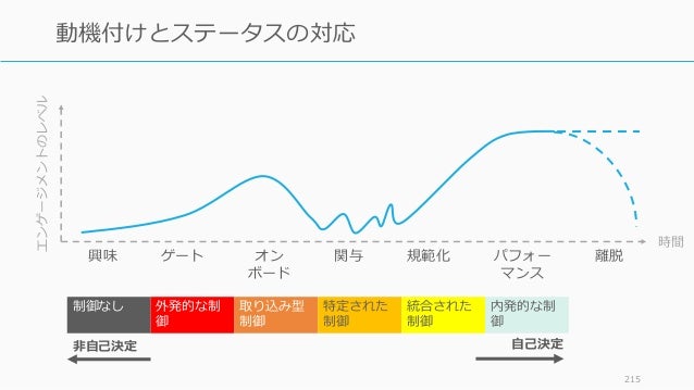 - 215. 215 動機付けとステータスの対応 制御なし 外発的な制 御 取り込み型 制御 特定された 制御 統合された 制御 内発的な制 御 時間 エンゲージメントのレベル 興味 ゲート オン ボード 関与 規範化 パフォー マンス 離脱 自己決定非自己決定