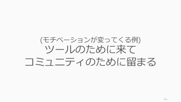 - 216. 216 (モチベーションが変ってくる例) ツールのために来て コミュニティのために留まる
