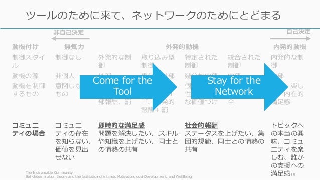- 218. 動機付け 無気力 外発的動機 内発的動機 制御スタイ ル 制御なし 外発的な制 御 取り込み型 制御 特定された 制御 統合された 制御 内発的な制 御 動機の源 非個人 外部 幾分か外部 幾分か内部 内部 内部 動機を制御 するもの 意図しない もの コンプライ アンス、外 部報酬、罰 自己コント ロール、エ ゴ、内発的 報酬+罰 個人の重要 性、意識的 な価値づけ 調和、覚醒、 自己との統 合 興味、楽し み、内在的 満足感 コミュニ ティの場合 コミュニ ティの存在 を知らない、 価値を見出 せない 即時的な満足感 問題を解決したい、スキル や知識を上げたい、同士と の情熱の共有 社会的報酬 ステータスを上げたい、集 団的規範、同士との情熱の 共有 トピックへ の本当の興 味、コミュ ニティを楽 しむ、誰か の支援への 満足感The Indispnsable Community Self-determination theory and the facilitation of intrinsic Motivation, ocial Development, and WellBeing 218 ツールのために来て、ネットワークのためにとどまる 自己決定非自己決定 Come for the Tool Stay for the Network