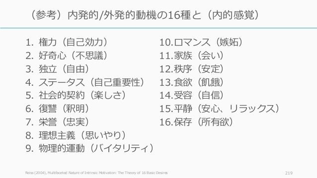 - 219. 1. 権力(自己効力) 2. 好奇心(不思議) 3. 独立(自由) 4. ステータス(自己重要性) 5. 社会的契約(楽しさ) 6. 復讐(釈明) 7. 栄誉(忠実) 8. 理想主義(思いやり) 9. 物理的運動(バイタリティ) 10.ロマンス(嫉妬) 11.家族(会い) 12.秩序(安定) 13.食欲(飢餓) 14.受容(自信) 15.平静(安心、リラックス) 16.保存(所有欲) Reiss (2004), Multifaceted Nature of Intrinsic Motivation: The Theory of 16 Basic Desires 219 (参考)内発的/外発的動機の16種と(内的感覚)