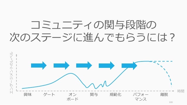 - 220. 220 コミュニティの関与段階の 次のステージに進んでもらうには? 時間 エンゲージメントのレベル 興味 ゲート オン ボード 関与 規範化 パフォー マンス 離脱