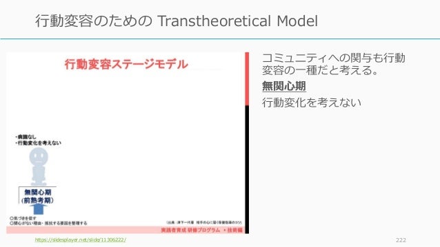 - 222. コミュニティへの関与も行動 変容の一種だと考える。 無関心期 行動変化を考えない https://slidesplayer.net/slide/11306222/ 222 行動変容のための Transtheoretical Model