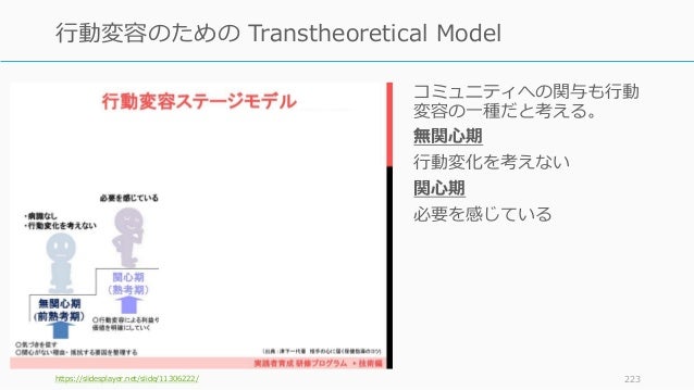 - 223. コミュニティへの関与も行動 変容の一種だと考える。 無関心期 行動変化を考えない 関心期 必要を感じている https://slidesplayer.net/slide/11306222/ 223 行動変容のための Transtheoretical Model