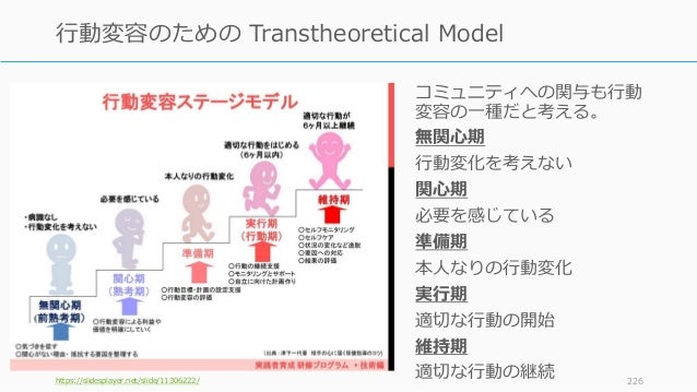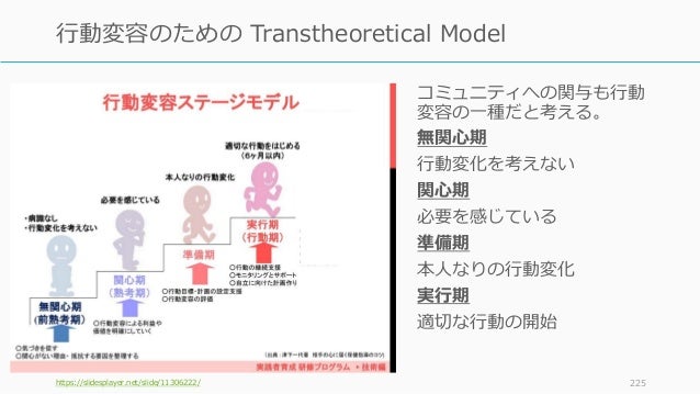 - 224. コミュニティへの関与も行動 変容の一種だと考える。 無関心期 行動変化を考えない 関心期 必要を感じている 準備期 本人なりの行動変化 https://slidesplayer.net/slide/11306222/ 224 行動変容のための Transtheoretical Model