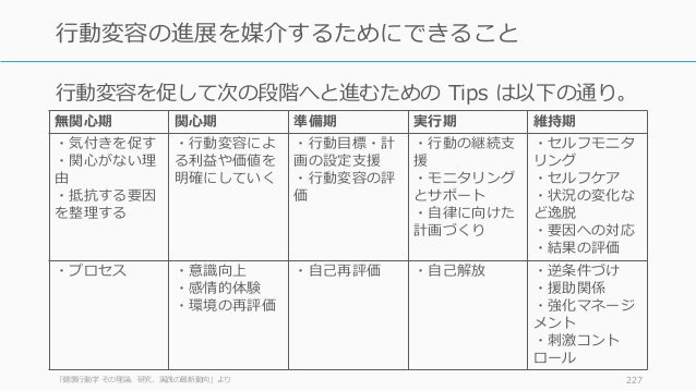 - 227. 無関心期 関心期 準備期 実行期 維持期 ・気付きを促す ・関心がない理 由 ・抵抗する要因 を整理する ・行動変容によ る利益や価値を 明確にしていく ・行動目標・計 画の設定支援 ・行動変容の評 価 ・行動の継続支 援 ・モニタリング とサポート ・自律に向けた 計画づくり ・セルフモニタ リング ・セルフケア ・状況の変化な ど逸脱 ・要因への対応 ・結果の評価 ・プロセス ・意識向上 ・感情的体験 ・環境の再評価 ・自己再評価 ・自己解放 ・逆条件づけ ・援助関係 ・強化マネージ メント ・刺激コント ロール 「健康行動学 その理論、研究、実践の最新動向」より 227 行動変容の進展を媒介するためにできること 行動変容を促して次の段階へと進むための Tips は以下の通り。