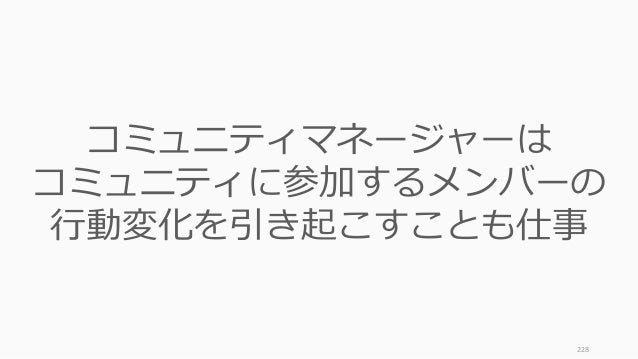 - 228. 228 コミュニティマネージャーは コミュニティに参加するメンバーの 行動変化を引き起こすことも仕事