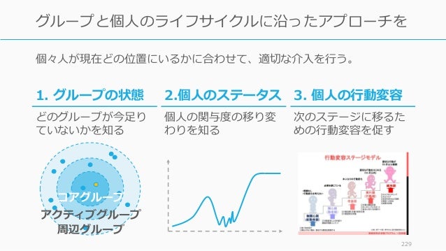 - 229. 個々人が現在どの位置にいるかに合わせて、適切な介入を行う。 229 グループと個人のライフサイクルに沿ったアプローチを コアグループ アクティブグループ 周辺グループ 3. 個人の行動変容 次のステージに移るた めの行動変容を促す 1. グループの状態 どのグループが今足り ていないかを知る 2.個人のステータス 個人の関与度の移り変 わりを知る