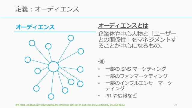 - 23. オーディエンスとは 企業体や中心人物と「ユーザー との関係性」をマネジメントす ることが中心になるもの。 例) • 一部の SNS マーケティング • 一部のファンマーケティング • 一部のインフルエンサーマーケ ティング • PR や広報など 参考 https://medium.com/@davidspinks/the-difference-between-an-audience-and-a-community-c4a38059a952 23 定義:オーディエンス オーディエンス