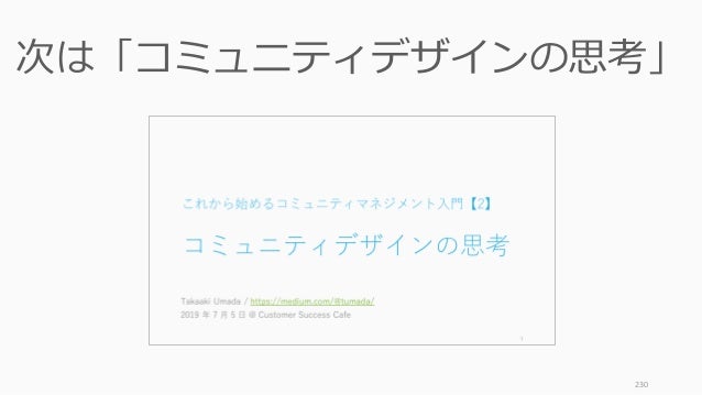 - 1. これから始めるコミュニティマネジメント入門【1】 コミュニティマネジメント とは何か、なぜ今重要か Takaaki Umada / https://medium.com/@tumada/ 2019 年 7 月 5 日 @ Customer Success Cafe 1