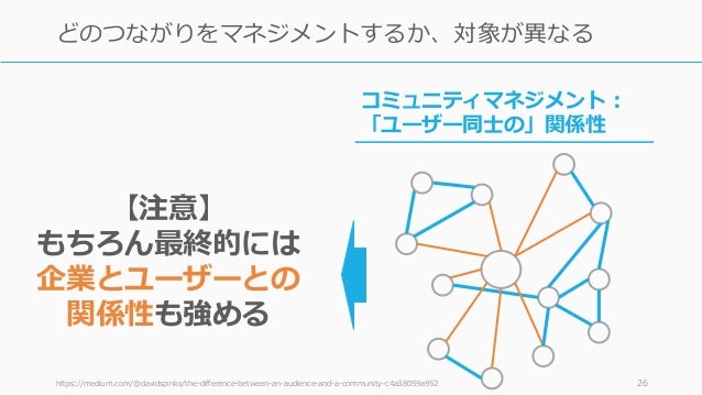 - 25. https://medium.com/@davidspinks/the-difference-between-an-audience-and-a-community-c4a38059a952 25 どのつながりをマネジメントするか、対象が異なる オーディエンスマネジメント: 「ユーザーとの」関係性 コミュニティマネジメント: 「ユーザー同士の」関係性
