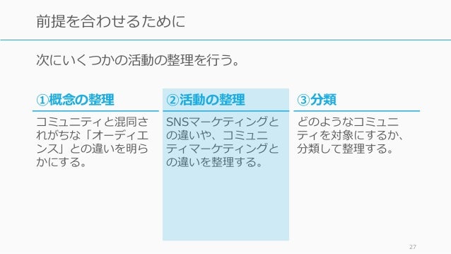 - 27. 次にいくつかの活動の整理を行う。 27 前提を合わせるために ③分類 どのようなコミュニ ティを対象にするか、 分類して整理する。 ①概念の整理 コミュニティと混同さ れがちな「オーディエ ンス」との違いを明ら かにする。 ②活動の整理 SNSマーケティングと の違いや、コミュニ ティマーケティングと の違いを整理する。