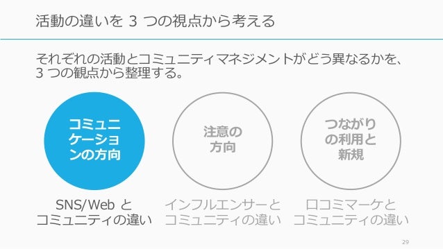 - 28. それぞれの活動とコミュニティマネジメントがどう異なるかを、 3 つの観点から整理する。 28 活動の違いを 3 つの視点から考える コミュニ ケーショ ンの方向 注意の 方向 つながり の利用と 新規 SNS/Web と コミュニティの違い インフルエンサーと コミュニティの違い 口コミマーケと コミュニティの違い