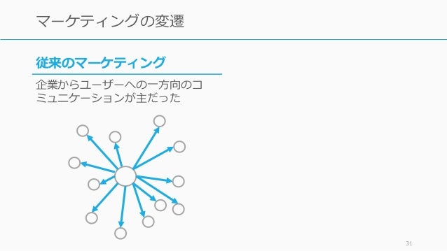 - 31. 31 マーケティングの変遷 従来のマーケティング 企業からユーザーへの一方向のコ ミュニケーションが主だった