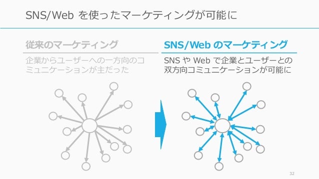 - 32. 32 SNS/Web を使ったマーケティングが可能に SNS/Web のマーケティング SNS や Web で企業とユーザーとの 双方向コミュニケーションが可能に 従来のマーケティング 企業からユーザーへの一方向のコ ミュニケーションが主だった