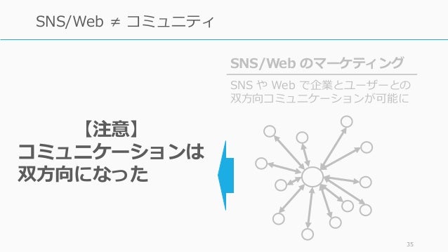 - 35. 35 SNS/Web ≠ コミュニティ SNS/Web のマーケティング SNS や Web で企業とユーザーとの 双方向コミュニケーションが可能に 【注意】 コミュニケーションは 双方向になったけれど コミュニティを 作っているわけではない