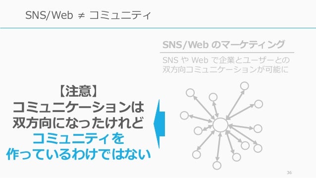 - 36. 36 SNS/Web ≠ コミュニティ SNS/Web のマーケティング SNS や Web で企業とユーザーとの 双方向コミュニケーションが可能に 【注意】 コミュニケーションは 双方向になったけれど コミュニティを 作っているわけではない