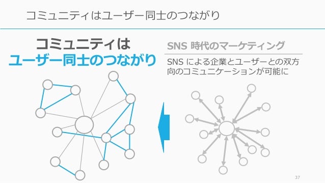 - 37. 37 コミュニティはユーザー同士のつながり SNS 時代のマーケティング SNS による企業とユーザーとの双方 向のコミュニケーションが可能に コミュニティは ユーザー同士のつながり