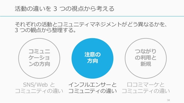 - 38. それぞれの活動とコミュニティマネジメントがどう異なるかを、 3 つの観点から整理する。 38 活動の違いを 3 つの視点から考える コミュニ ケーショ ンの方向 注意の 方向 つながり の利用と 新規 SNS/Web と コミュニティの違い インフルエンサーと コミュニティの違い 口コミマーケと コミュニティの違い