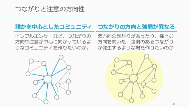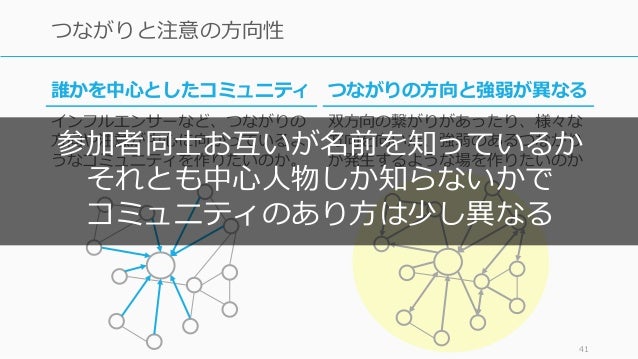 - 40. 40 つながりと注意の方向性 つながりの方向と強弱が異なる 双方向の繋がりがあったり、様々な 方向を向いた、強弱のあるつながり が発生するような場を作りたいのか 誰かを中心としたコミュニティ インフルエンサーなど、つながりの 方向や注意が中心に向かっているよ うなコミュニティを作りたいのか。
