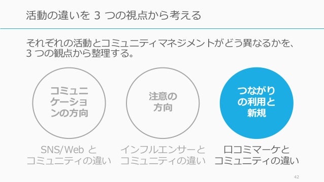 - 42. それぞれの活動とコミュニティマネジメントがどう異なるかを、 3 つの観点から整理する。 42 活動の違いを 3 つの視点から考える コミュニ ケーショ ンの方向 注意の 方向 つながり の利用と 新規 SNS/Web と コミュニティの違い インフルエンサーと コミュニティの違い 口コミマーケと コミュニティの違い