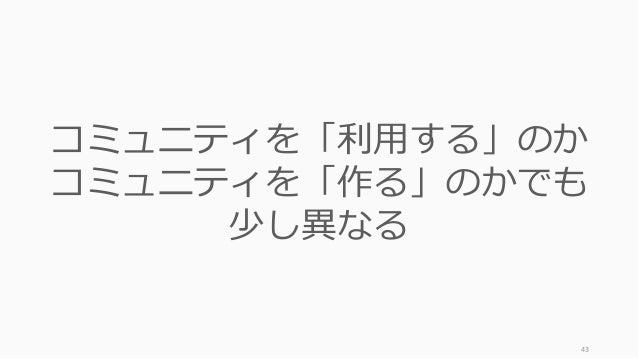 - 43. 43 コミュニティを「利用する」のか コミュニティを「作る」のかでも 少し異なる