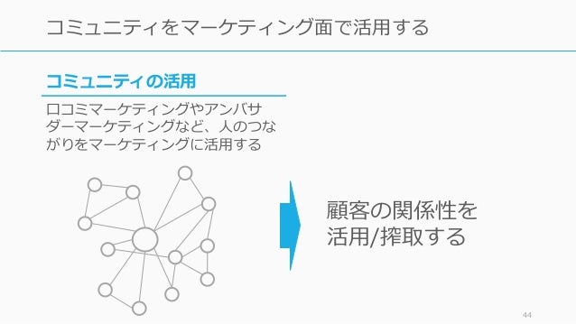 - 44. 44 コミュニティをマーケティング面で活用する コミュニティの活用 口コミマーケティングやアンバサ ダーマーケティングなど、人のつな がりをマーケティングに活用する 顧客の関係性を 活用/搾取する