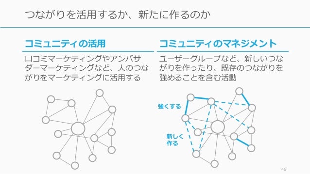 - 46. 46 つながりを活用するか、新たに作るのか コミュニティのマネジメント ユーザーグループなど、新しいつな がりを作ったり、既存のつながりを 強めることを含む活動 強くする 新しく 作る コミュニティの活用 口コミマーケティングやアンバサ ダーマーケティングなど、人のつな がりをマーケティングに活用する