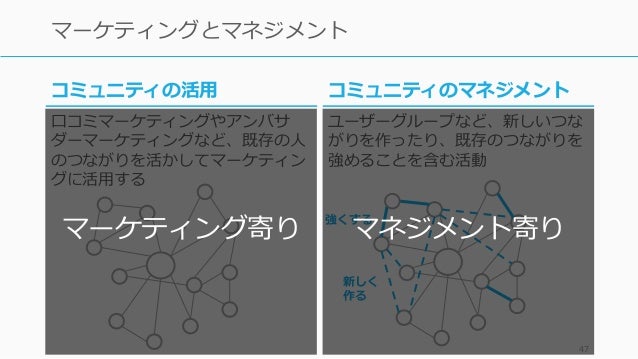 - 47. 47 マーケティングとマネジメント コミュニティのマネジメント ユーザーグループなど、新しいつな がりを作ったり、既存のつながりを 強めることを含む活動 強くする 新しく 作る コミュニティの活用 口コミマーケティングやアンバサ ダーマーケティングなど、既存の人 のつながりを活かしてマーケティン グに活用する マーケティング寄り マネジメント寄り
