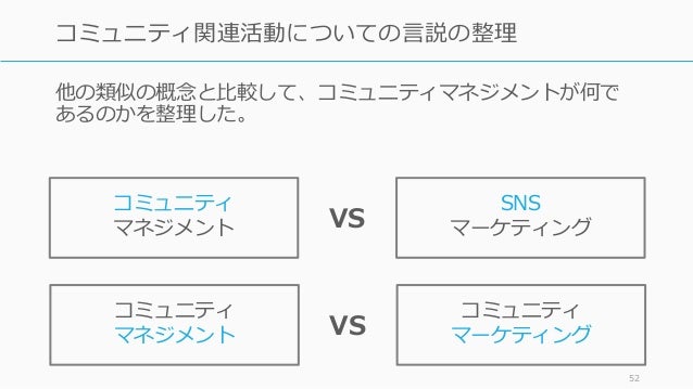 - 52. 他の類似の概念と比較して、コミュニティマネジメントが何で あるのかを整理した。 52 コミュニティ関連活動についての言説の整理 コミュニティ マネジメント SNS マーケティングVS コミュニティ マネジメント コミュニティ マーケティングVS