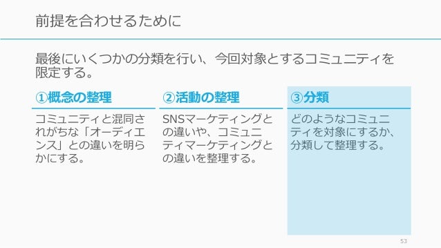 - 53. 最後にいくつかの分類を行い、今回対象とするコミュニティを 限定する。 53 前提を合わせるために ③分類 どのようなコミュニ ティを対象にするか、 分類して整理する。 ①概念の整理 コミュニティと混同さ れがちな「オーディエ ンス」との違いを明ら かにする。 ②活動の整理 SNSマーケティングと の違いや、コミュニ ティマーケティングと の違いを整理する。