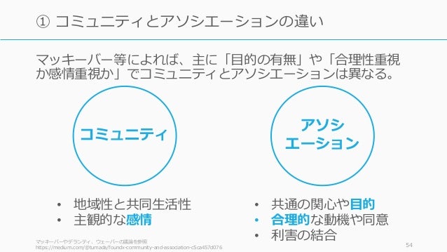 - 54. マッキーバー等によれば、主に「目的の有無」や「合理性重視 か感情重視か」でコミュニティとアソシエーションは異なる。 マッキーバーやデランティ、ウェーバーの議論を参照 https://medium.com/@tumada/foundx-community-and-association-c5ca457d076 54 ① コミュニティとアソシエーションの違い コミュニティ アソシ エーション • 地域性と共同生活性 • 主観的な感情 • 共通の関心や目的 • 合理的な動機や同意 • 利害の結合