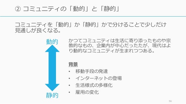 - 56. かつてコミュニティは生活に寄り添ったものや宗 教的なもの、企業内が中心だったたが、現代はよ り動的なコミュニティが生まれつつある。 背景 • 移動手段の発達 • インターネットの登場 • 生活様式の多様化 • 雇用の変化 56 ② コミュニティの「動的」と「静的」 動的 静的 コミュニティを「動的」か「静的」かで分けることで少しだけ 見通しが良くなる。