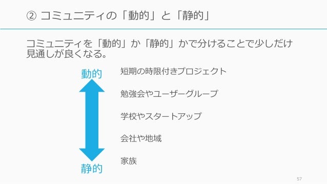 - 57. 短期の時限付きプロジェクト 勉強会やユーザーグループ 学校やスタートアップ 会社や地域 家族 57 ② コミュニティの「動的」と「静的」 動的 静的 コミュニティを「動的」か「静的」かで分けることで少しだけ 見通しが良くなる。