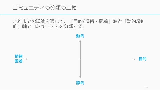 - 58. これまでの議論を通して、「目的/情緒・愛着」軸と「動的/静 的」軸でコミュニティを分類する。 58 コミュニティの分類の二軸 目的 情緒 愛着 動的 静的