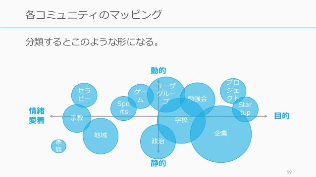 - 59. 分類するとこのような形になる。 59 各コミュニティのマッピング 企業 Star tup 地域 政治 Spo rts ゲー ム 家 族 目的 動的 静的 勉強会 学校 セラ ピー ユーザ グルー プ プロ ジェ クト 情緒 愛着 宗教