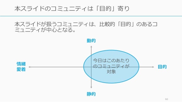 - 60. 本スライドが扱うコミュニティは、比較的「目的」のあるコ ミュニティが中心となる。 60 本スライドのコミュニティは「目的」寄り 目的 動的 静的 今日はこのあたり のコミュニティが 対象 情緒 愛着
