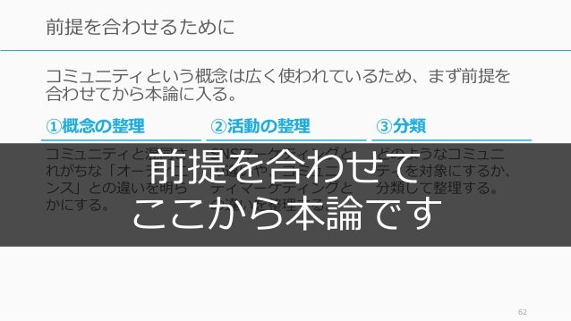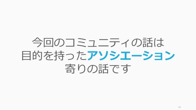 - 61. 61 今回のコミュニティの話は 目的を持ったアソシエーション 寄りの話です