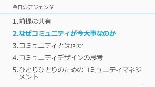 - 64. 1.前提の共有 2.なぜコミュニティが今大事なのか 3.コミュニティとは何か 4.コミュニティデザインの思考 5.ひとりひとりのためのコミュニティマネジ メント 64 今日のアジェンダ